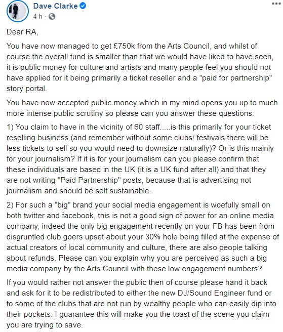 El fondo en cuestión, conocido como Fondo de Recuperación Cultural, consta de 500 millones de libras, y entregó ayudas de entre 50.000 y 3 millones de libras a cada solicitante que cumplió con las condiciones que pusieron. ¿De qué se ha quejado Clarke concretamente? Inicialmente, de que Resident Advisor se lleve dinero destinado a la cultura y los artistas cuando, según Clarke, sólo se dedican a revender entradas para eventos y publicar contenido no por su interés cultural o periodístico, si no porque les paguen por ello, aunque a lo largo de su carta lanza diversas perlas. En la siguiente captura podéis ver la publicación, a la que se puede acceder en este enlace: https://www.facebook.com/100044460518348/posts/207075524117797/?extid=0&d=n